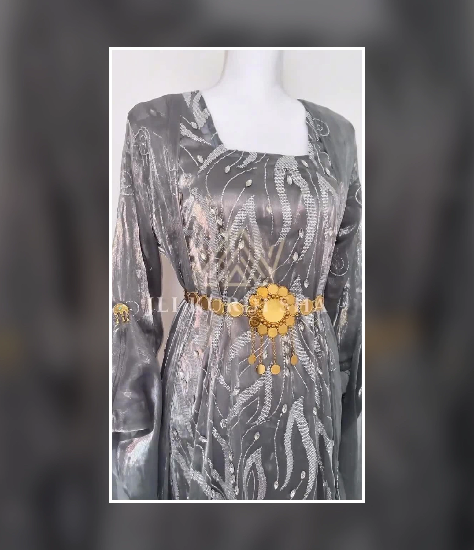 An elegant silver Kurdish dress featuring detailed embroidery, perfect for weddings, parties, and special occasions.